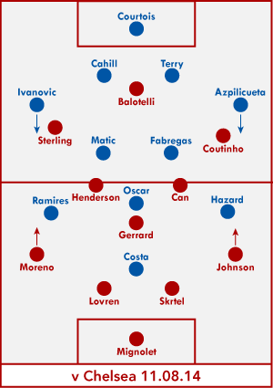 And Liverpool started well, as they did at City and against Madrid at Anfield. And this time, Liverpool actually reaped an early goal reward. Lovren and Mignolet passed the ball out from the back surprisingly well, Henderson and Sterling found space in midfield, and Can's deflected shot left Courtois flat-footed. It's probably not coincidence that Sterling started on the left, where he's much better than on the right, and cutting inside into space and running at defenders led to an assist.