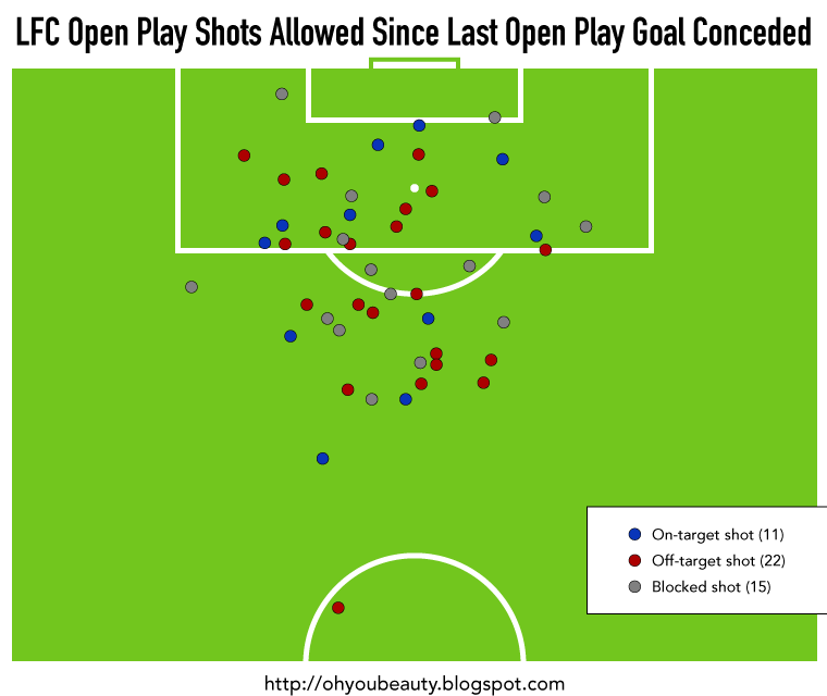 Liverpool have only allowed 48 open play shots over this stretch, but 83 shots in total. 35 set play shots allowed – whether they're penalties, free kicks, or stemming from corners or free kicks – seems a pretty high total; it's one every 22.3 minutes. And yes, Liverpool have allowed those aforementioned four set plays goals.