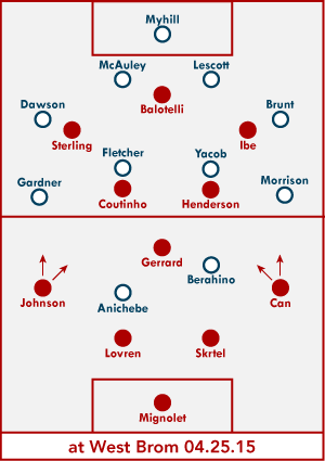 Still, it's not as if Liverpool made it hard for West Brom. 4-3-3 with a very wide front three meant that Liverpool dominated possession but couldn't create a single thing inside the final third, with Sterling and Ibe doubled up and Balotelli completely isolated. Players were static in attack with at least eight West Brom defenders behind the ball and final third passes routinely went astray, with Liverpool players shouting at each other about the run or pass that should have been made.