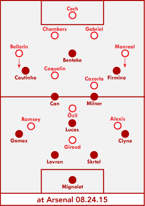 We've seen a little bit of the diamond and a little bit of the 4-2-3-1 in preseason, but 4-3-3 has been Rodgers' preferred formation. Which isn't necessarily a surprise; it's seemingly always been his preferred formation, forced into changes in previous seasons by injuries or poor form. And it's not difficult to see how Liverpool's current personnel fit into that formation. Benteke or Sturridge or Ings or Origi up front; two from Coutinho, Firmino, Lallana, and Ibe out wide; three from Henderson, Milner, Allen, Can, and Lucas in midfield; Clyne and Moreno or Gomez at fullback; Skrtel and Lovren or Sakho in defense.