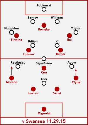 In our early dominant possession we created a number of very dangerous sequences of play. Even though much of that did not culminate in a shot. Ibe dribbling into the box with a last slightly heavy touch that the defender deflected against the post. He needed a softer touch directed more towards goal and he was in. Firmino with a cut back pass to the left that was just cut out at the last second. Lallana with a close in shot that was blocked at the last second. I think the ball over the top to Benteke that he miscontrolled was in this part of the game too. Swans were hanging on by the skin of their teeth.