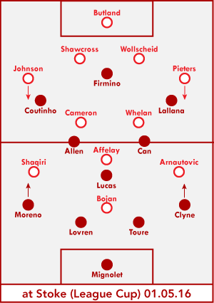 Unlike in almost all of Liverpool's other matches over the last month, Liverpool were given space to play, space to attack, in the first half. The opposition wanted to take the game to Liverpool, which allowed Liverpool to return the favor when opportunities presented themselves: pressing Stoke into mistakes and attacking at pace. Liverpool started the brighter side and pinned Stoke back early, then settled into more of a counter-attacking groove when Coutinho picked up a 17th-minute injury.