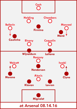 Coutinho remained the epicenter of everything good in attack, first releasing Wijnaldum with a typically tricky blind outside-of-the-boot throughball. Wijnaldum crossed to Lallana, seemingly losing the opportunity by taking it on his chest but actually creating the space to get away from Monreal and somehow beat Cech at the near post. Seven minutes later, Coutinho finished off a 19-pass move, charging into the box to convert Clyne's low cross in front of a slow-to-react Rob Holding. And two minutes after that, he should have had a hat-trick, but a shot similar to his previous goal was a foot too close to Cech.