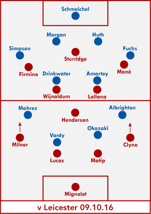And, like Burnley, Leicester started the brighter side. Leicester immediately took the ball deep into Liverpool's end, Leicester immediately targeted the space between Lucas and Milner, two midfielders playing as defenders. But Liverpool maintained, Liverpool adequately defended a first-minute corner (and the next six), and Liverpool eventually took control. And then the goals came.